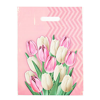 Пакет подарочный полиэтиленовый с нежными тюльпанами.