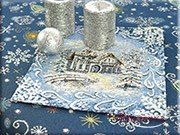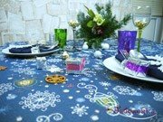 Скатерть насыщенного синего цвета с использованием серебристой металлизированной нити, которая придает изделию блеск, прекрасно сочетается с новогодним убранством комнаты - мишурой, шарами, гирляндами. Рисунок также содержит элементы праздника -снежинки, фонарики, звездочки. Отделана скатерть серебристой тесьмой вьюнок, что придает ей еще большую нарядность и праздничность.