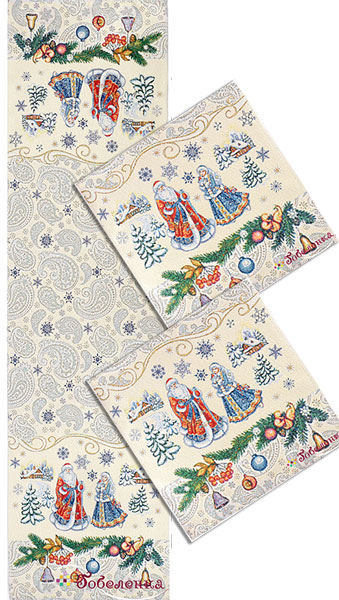 Новогодний комплект включает длинную салфетку-дорожку и 2 индивидуальные салфетки. Послужит приятным декором праздничного стола.