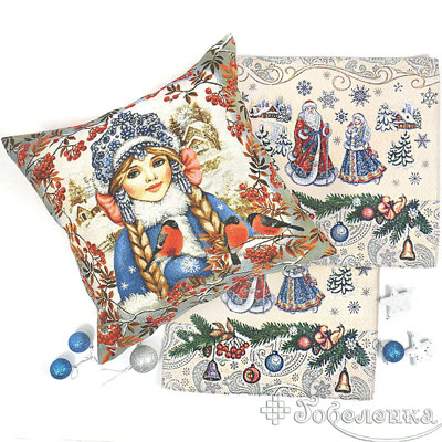 Новогодний комплект из сюжетной наволочки со Снегурочкой на подушку и двумя салфетками.