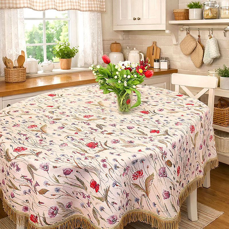 Круглая гобеленовая скатерть Полевые цветы с ярким рисунком маков, колокольчиков и васильков на розово-бежевом фоне. Она изготовлена в традиционном стиле гобелена и украшена бахромой, что придает ей особый шарм и элегантность.
