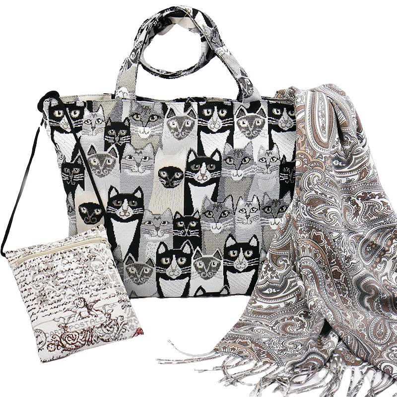 Отличный подарок с сумка с изображением котиков, гобеленовые котики в стиле бохо-шик, вдохновленном Уильямом Моррисом, демонстрируют очарование гобелна в монохроматической палитре черного, белого и серого, где сумка сочетается с шарфом с узором пейсли и винтажной сумочкой для телефона из гобеленовой ткани Романс, все в нейтральной и земляной цветовой палитре с оттенками теплого коричневого и серого - стильно и креативно.